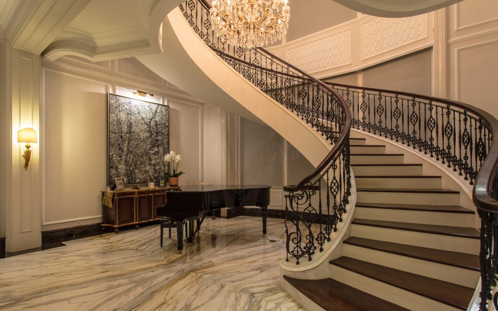 The design strikes a balance between formality and comfort. Symmetry in the seating arrangement emphasizes structure and order, while soft fabrics and thoughtful decorative details ensure the space feels inviting and livable. This home perfectly merges classical grandeur with understated luxury.